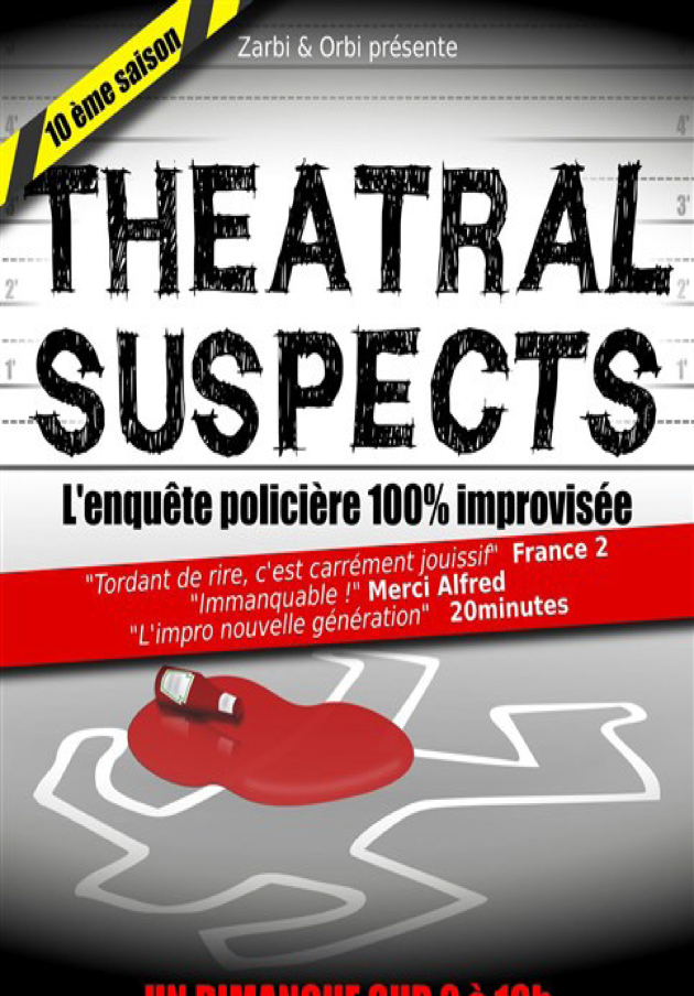 1 meurtre, 1 inspecteur, des suspects profilés par le public. Au fil de l’enquête, les suspects sont soumis à la méthode I.M.P.R.O : celle que les R.G. n’utilisent que dans les cas désespérés. A vous de les faire parler… sur les thèmes de votre choix. Theatral Suspects est le spectacle qui va vous changer de Derrick et Colombo !