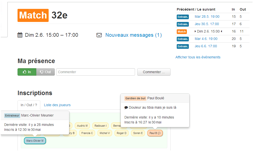 On a 25 joueurs inscrits. Quand je vois la liste des joueurs inscrits, je fais la composition de manière très rapide et ensuite j’envoie un message aux joueurs pour leur indiquer la composition. Je gagne du temps, car je n’ai plus besoin d’envoyer d’emails à chaque joueur. On y a tous gagné, surtout moi !