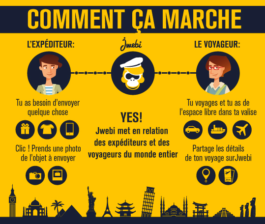 Avec Jwebi, tout le monde est gagnant : les expéditeurs payent moins cher leurs envois et reçoivent leurs objets rapidement, tandis que les voyageurs rentabilisent une partie de leurs frais de déplacement.