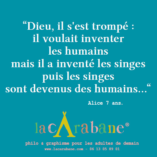 - “Dieu, il s’est trompé : il voulait inventer les humains mais il a inventé les singes puis les singes sont devenus des humains…” – Alice 7 ans.