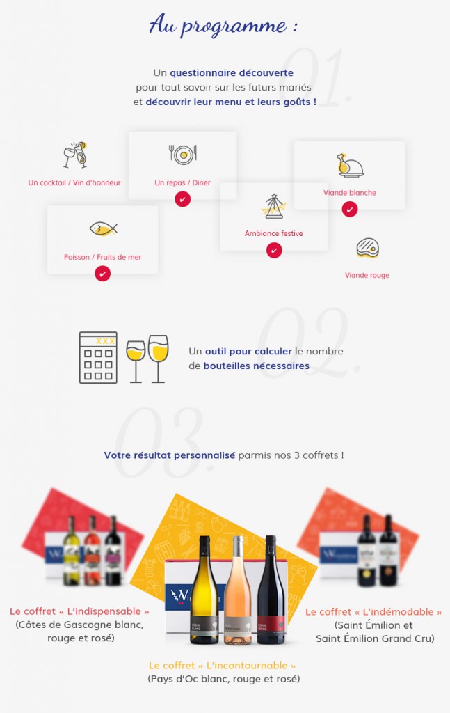 Les fondateurs de Winedding ont réussi à synthétiser les besoins principaux de tous les mariages en 3 coffrets qui sont sélectionnés à partir d’un questionnaire à remplir par les futurs mariés. Trois choix peuvent leur être proposés :